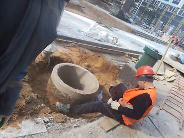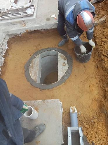 - Устройство колодцев: приемные, смотровые, распределительные (железобетон/пластик), формирование лотков, герметизация швов.