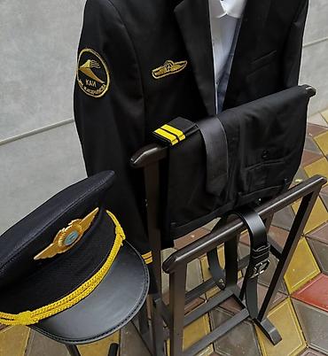 - Китель темно‑синий/черный с золотыми нашивками: эмблема крыльев на груди, шеврон на рукаве, золотые полосы на манжетах.