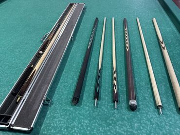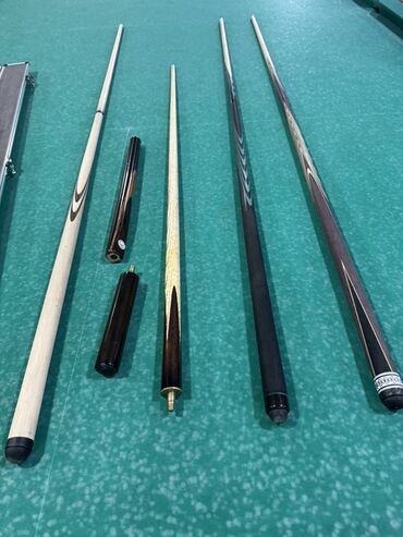 - Несколько разборных киев для русского бильярда/пула: древки светлые из твердых пород, рукояти с декоративными вставками и фигурной раскладкой шпона.