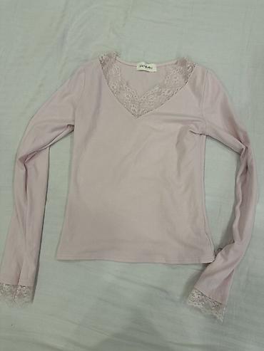 1) Лонгслив пудрово‑розового цвета с V‑образным вырезом и кружевной отделкой по горловине и манжетам. Длинный рукав, мягкий эластичный трикотаж, приталенный силуэт. Аккуратная ажурная кайма добавляет нежности и подойдет как для повседневных образов, так и под жакет.