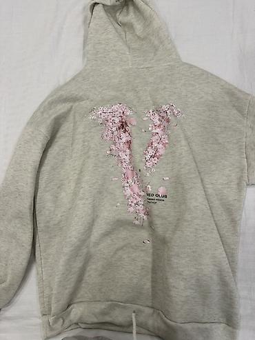 2) Худи светло‑серого меланжа с капюшоном и принтом на груди в виде крупной буквы V из розовых «лепестков». Мягкий флис внутри, свободная посадка, длинные рукава, эластичные манжеты и низ, регулируемый шнурок по подолу. На принте также есть небольшая надпись “MED CLUB”.