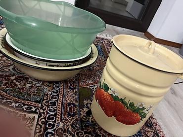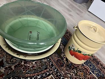 - Три глубокие миски/тазика: два эмалированных (кремовые, один с цветочным декором по борту) и один большой пластиковый полупрозрачный зелёный. Удобны для мытья и замачивания овощей/фруктов, приготовления салатов, теста, маринадов.