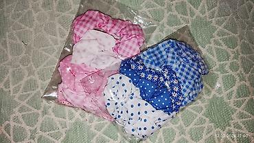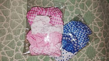 2) Принтованные тканевые: 2 отдельные упаковки. Розовая гамма (клетка, горох, мелкие узоры) и синяя гамма (клетка, горох, цветочки). Каждая упаковка содержит набор из нескольких скранчей с разными рисунками в едином тоне.