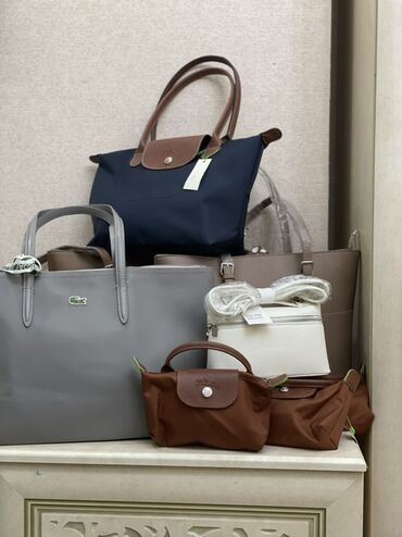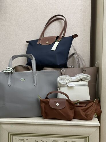 - Лаконичные шопперы из гладкой экокожи (серый с логотипом Lacoste, бежевые фактурные). Прямоугольная форма, длинные ручки для ношения на плече, вместительное основное отделение.