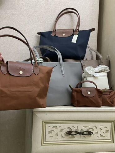 - Лёгкие складные сумки-тоты из нейлона с коричневыми кожаными ручками и клапаном на кнопке (тёмно‑синяя, терракотово‑коричневые, мини‑версии косметичек/клатчей). Закрытие на молнию под клапаном, фирменная кнопка, компактно складываются.