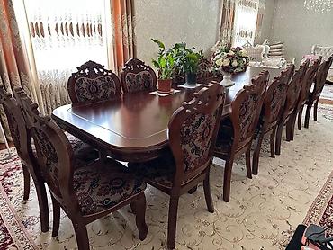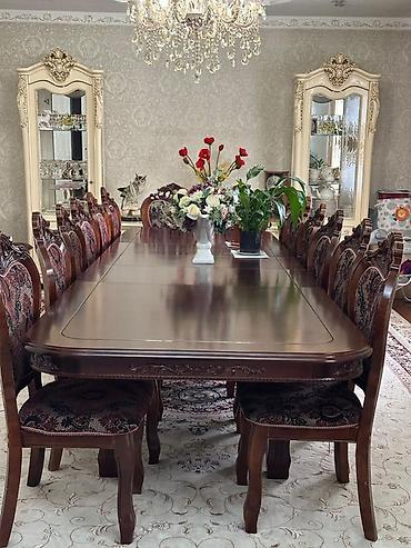 - большой прямоугольный обеденный стол из массива дерева с резным декором по борту и фигурными опорами;