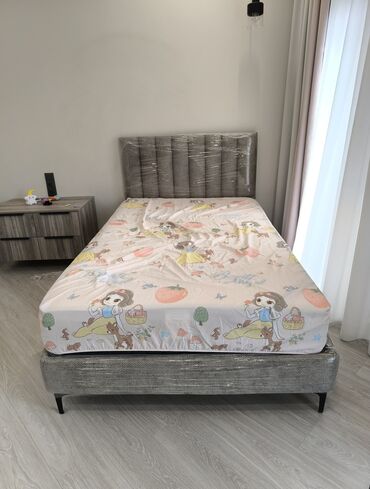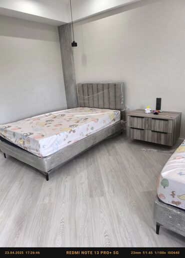 С мягким изголовьемОдноспальная кровать с мягким изголовьем, обтянутым тканью серого цвета. Изголовье имеет вертикальную прострочку, что придает ему стильный и современный вид. Каркас кровати обтянут той же тканью, что и изголовье, и стоит на четырех черных ножках, обеспечивая устойчивость. В комплекте идет матрас, подходящий для односпального использования. Эта кровать станет удобным и функциональным дополнением для детской или гостевой комнаты.