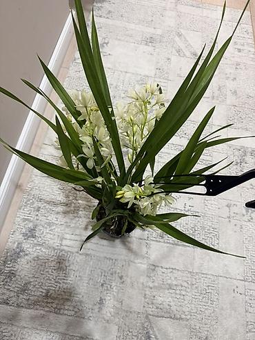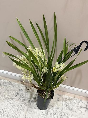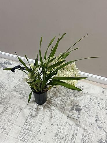 Орхидея в горшке — предположительно дендробиум (компактный куст с многочисленными белыми соцветиями и узкими ланцетными листьями).