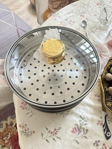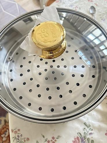 - Комплектация: основание-кастрюля, 2 перфорированных вставки для приготовления на пару, стеклянная крышка с массивной золотистой ручкой.