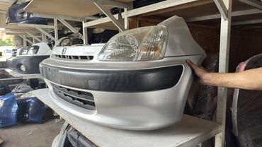 Передняя часть (морда) для Toyota Duet первого поколения (около 1999–2002 г.): бампер в сборе с решеткой радиатора, фарами, указателями поворота и декоративными молдингами. Цвет — светло‑серебристы...