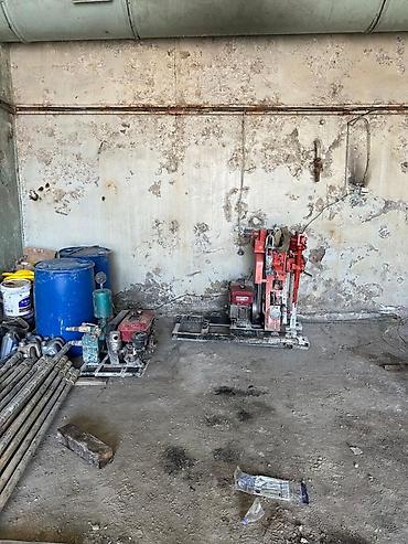 - Компактная буровая установка на раме с бензиновым приводом (красный агрегат на салазках), подходит для бурения разведочных/инженерных скважин, отбора керна и зондирования грунтов.