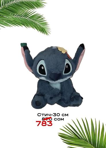 1) Игрушка «Стич» — высота 30 см. Мягкий плюшевый, большие ушки, бирюзовые глазки, на голове декоративный цветок. Цена: 783 сом