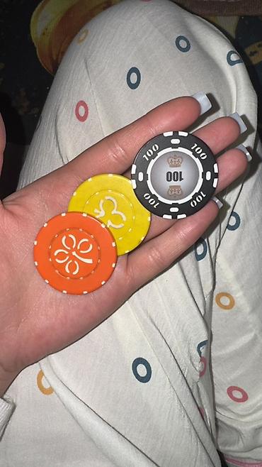 - Номиналы: в наборе преобладают черные фишки с номиналом 100; также есть фишки желтого и оранжевого цветов (без номинала/с рисунком мастей).