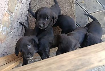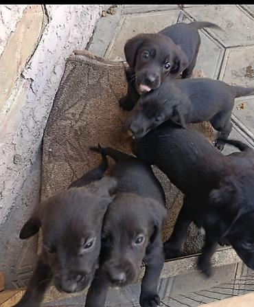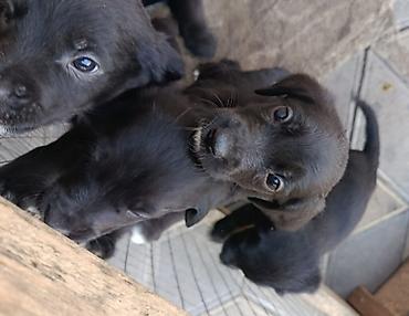 Помесь овчарка с спаниелем Щенки, черные короткошерстные, помет из нескольких малышей. Активные, контактные, любопытные. Окрас преимущественно угольно‑черный, встречаются белые отметины на груди и подбородке. Глаза темные, уши полувисячие, хвосты длинные. Компактные, ладные, с прямыми лапами.