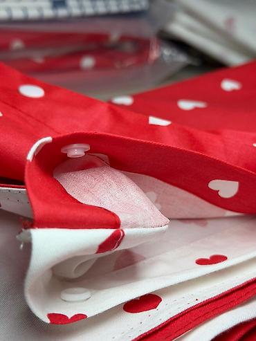 - Комплекты с принтами: красные и белые сердечки; синие и белые полосы.