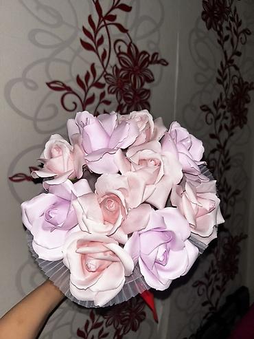- Состав: реалистичные розы из вспененного EVA/латекса в нежных розово‑лиловых оттенках, декоративная юбочка‑флористическая упаковка с перламутровым кантами, атласный бант. Вариант с мягкой игрушкой (розовый зайчик/персонаж) в центре.