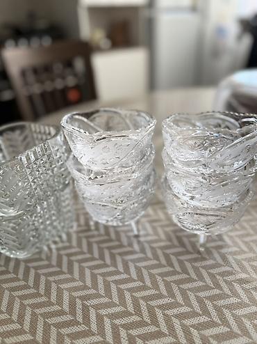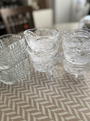 Посуда - Количество: 4 штук (по 2 штуки). - Материал: прозрачное толстое стекло. - Декор: классическая алмазная и звездчатая грань, рельефные бортики. - Форма: круглые и близкие к квадратным, с во...