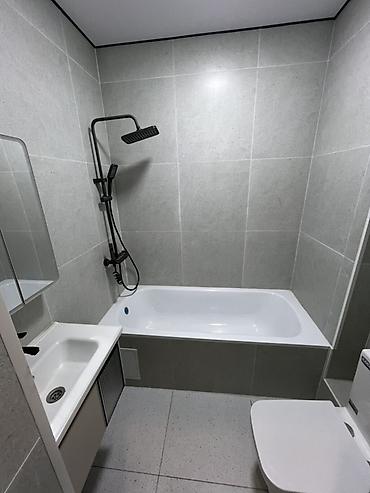 - Санузел совмещённый: ванна стандартного размера, душевой комплект «тропический душ» и ручная лейка, подвесная тумба с умывальником и зеркальным шкафом, унитаз. Стены и пол облицованы крупноформатной серой плиткой.