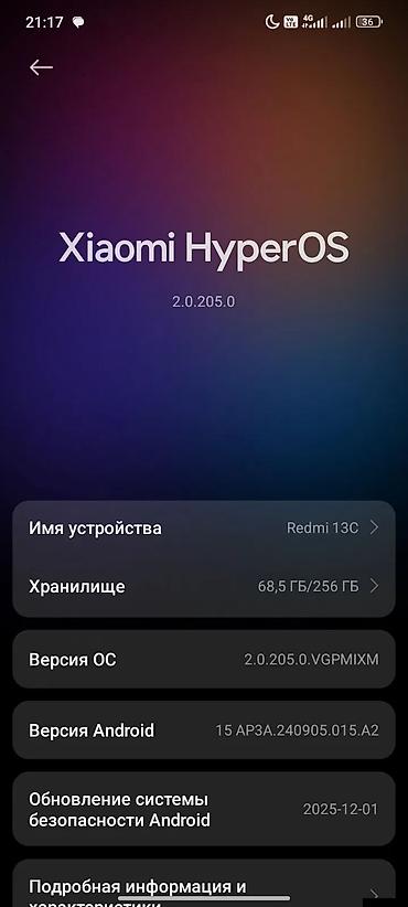 Смартфон Xiaomi Redmi 13C, цвет темно‑серый. Основные характеристики: - Память: 256 ГБ встроенной (на фото видно доступно ~46,6 ГБ при установленной системе). - ОС: Xiaomi HyperOS 2.0.205.0 на баз...