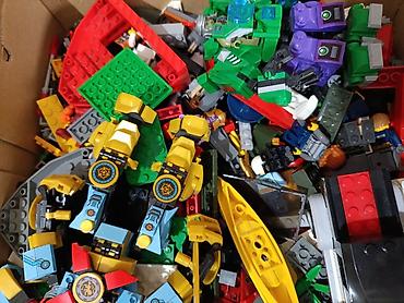 - Большая коробка со смешанной подборкой деталей LEGO разных серий и цветов: базовые кирпичики, пластины, техэлементы, шестерёнки, прозрачные элементы, аксессуары (мечи, щиты, оружие, декор).