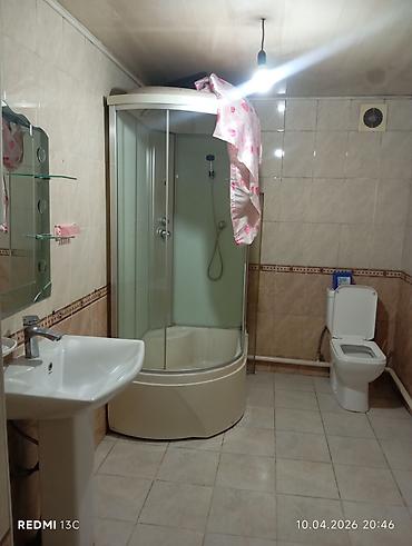 - Санузел объединённый: душевой бокс с дверцами, унитаз, керамическая раковина с современным смесителем, зеркало и стеклянные полки, вытяжка. Стены и пол облицованы плиткой.