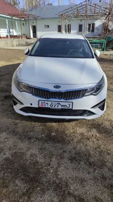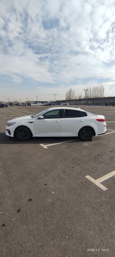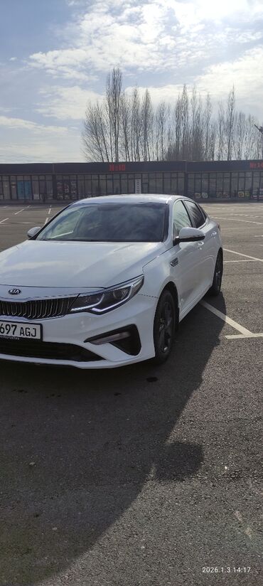 Kia Optima, белый седан бизнес‑класса. Киргизская регистрация (номера KG на фото). Современный рестайлинг с фирменной решеткой и светодиодной оптикой.
