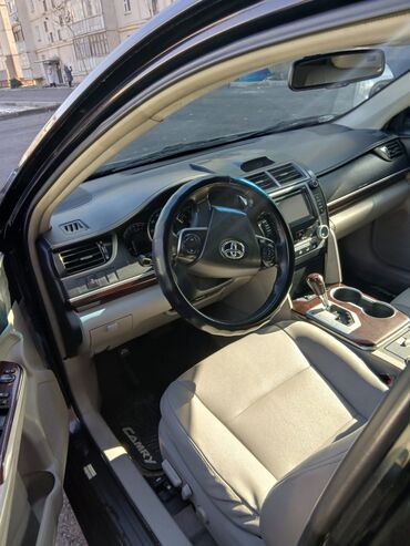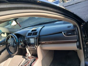 Интерьер светлый, комбинированная отделка с декоративными вставками «под дерево». Кожаные сиденья, водительское с электронастройками. Мультируль с кнопками управления, штатная мультимедийная система с цветным экраном, климат‑контроль, автоматическая коробка передач с селектором на центральном тоннеле, два подстаканника, подлокотник, электростеклоподъемники и электрозеркала. Коврики Camry.