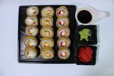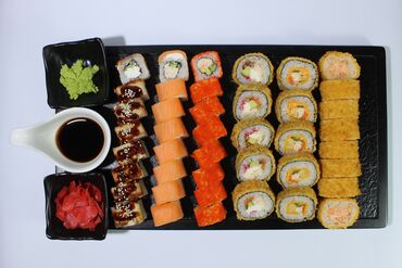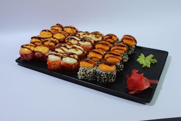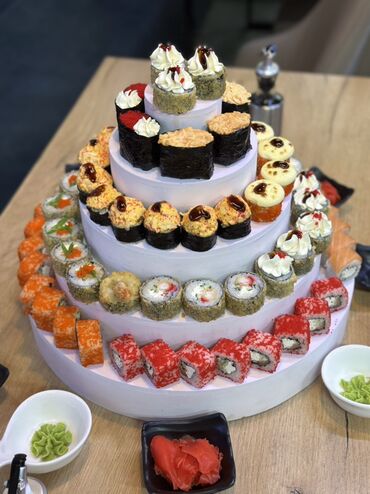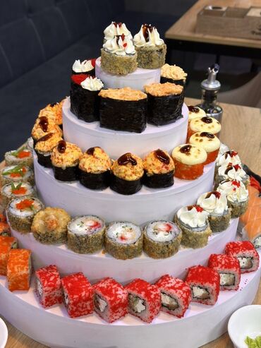 - Многоярусная подача роллов на круглой подставке: ассорти запечённых и классических роллов, гунканы с нежными начинками, хрустящие темпура-роллы, роллы в яркой икре масаго/тобико, варианты с сыром, крабом/крабовыми палочками, огурцом, сливочным сыром, соусом унаги и шапочками из соуса.