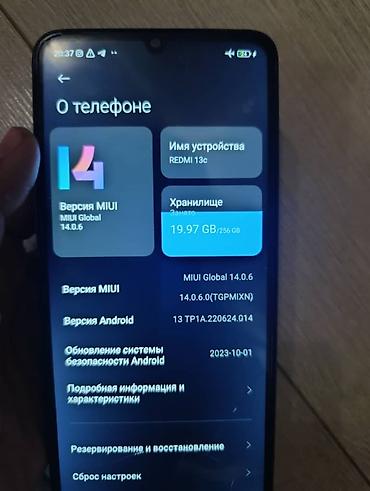 - На скриншотах «О телефоне»: устройство — REDMI 13C, занято ~20 ГБ из 256 ГБ.