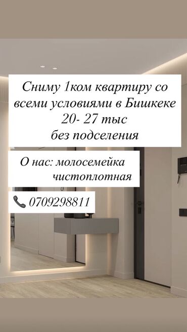 Сниму 1‑комнатную квартиру. Нужна срочно, до Нового года. Семейные, без вредных привычек. Бюджет до 30 000 сомов в месяц. Срок аренды — 4–5 месяцев. Рассмотрим варианты с базовой мебелью и техникой...
