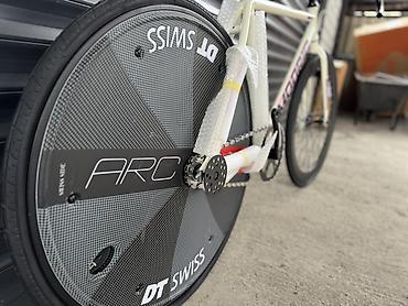 - Заднее — карбоновый дисковый колесный модуль DT SWISS ARC (аэродиск) с трековой втулкой