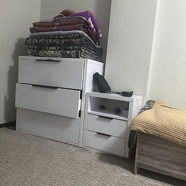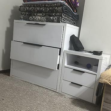 - Комплект из двух предметов: высокий комод с выдвижными ящиками и низкая прикроватная тумба.