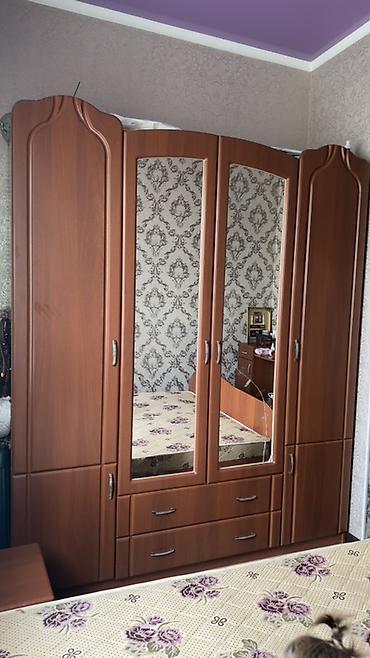 - Четырёхдверный шкаф-купе распашного типа: две центральные зеркальные двери, боковые секции для хранения. Внизу — два вместительных выдвижных ящика. Внутри отделения для одежды на плечиках и полки.
