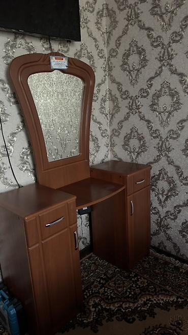 - Двухтумбовый туалетный стол с большим изогнутым зеркалом. По бокам — тумбы с дверцами и выдвижными ящиками, удобная столешница.