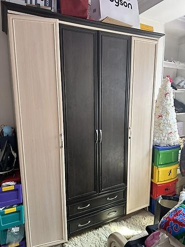 - Четырёхдверный платяной шкаф комбинированной расцветки: центральные тёмные створки и светлые боковые, классические рамочные фасады. Внизу два выдвижных ящика с металлическими ручками. Верх с карнизом.