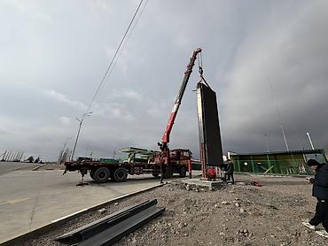 - Работа с морскими контейнерами, металлическими конструкциями, стойками, оборудованием и т. п. Примеры на фото: перегрузка контейнера и монтаж крупногабаритной стелы.