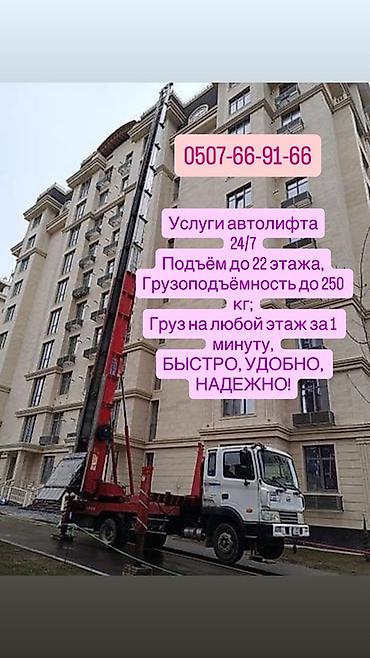 Услуги автолифта 24/7. - Подъем на высоту до 22 этажа - Грузоподъемность до 250 кг - Подача груза на любой этаж за 1 минуту - Работа по договору (ОсОО–ИП) Подходит для подъема мебели, стройматери...