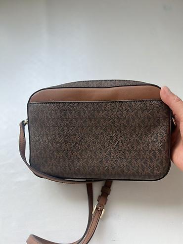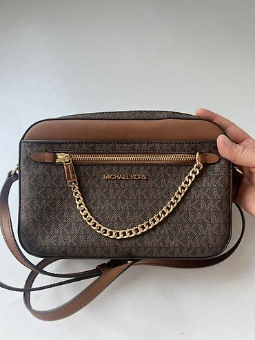 - Материал: фирменный монограмный канвас MK в темно-коричневом цвете с вставками из гладкой/саффьяно кожи карамельного оттенка