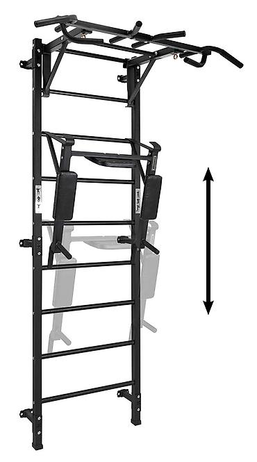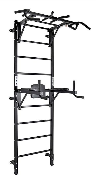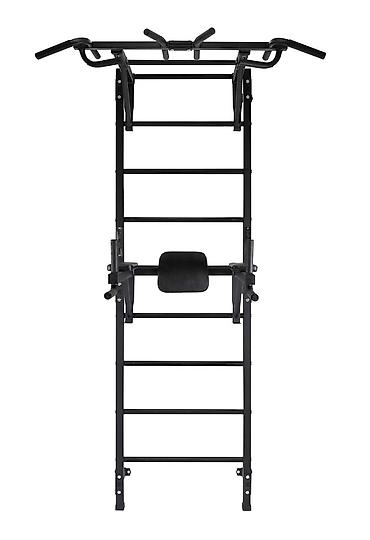 - Компактная вертикальная конструкция — домашний тренажерный комплекс «3 в 1»: турник, брусья/пресс, шведская лестница.