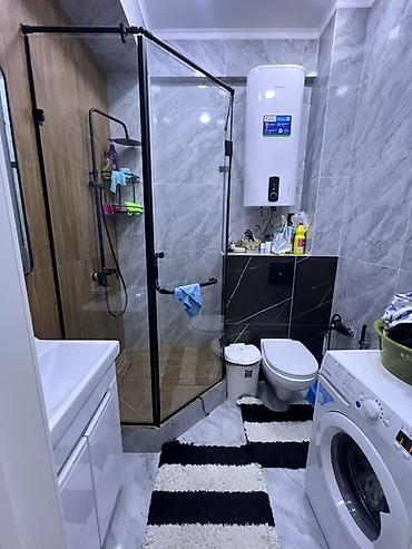 - Санузел с душевой кабиной в черной рамке: душ с полочками-органайзерами, навесной унитаз, тумба-умывальник с ящиками, стиральная машина, бойлер накопительный для горячей воды. Отделка стен крупноформатной плиткой «под мрамор» и деревом.
