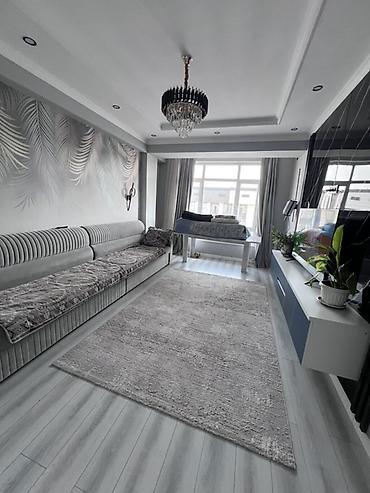 - Просторная гостиная: панорамное окно, двухуровневые потолки с точечным освещением, хрустальная люстра, акцентная стена с текстурными листьями, длинный модульный диван, настенная ТВ-тумба, декоративные шторы.