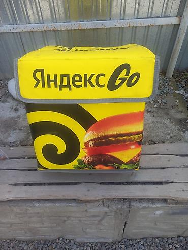 Термосумка для доставки еды под брендом Яндекс Go. Сумка выполнена в ярком желтом цвете с черно-желтым спиральным узором и изображением бургера на одной из сторон. Внутри сумка имеет серебристую термоизоляционную подкладку, предназначенную для поддержания температуры содержимого. Сбоку на крышке сумки расположен логотип "Яндекс Go".