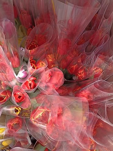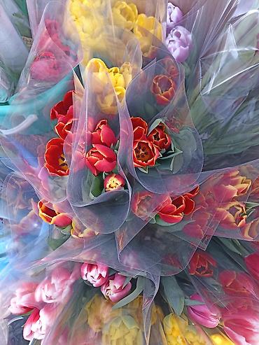 - Срезанные тюльпаны в однотонных и двухцветных сортах: красные, жёлтые, розовые, лиловые, бело-розовые, с каймой по лепесткам.