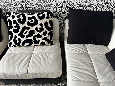 - Подушки в комплекте: 6 штук — 3 чёрные фактурные и 3 с контрастным чёрно-белым принтом.