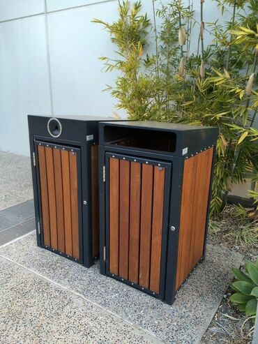 - Конструкция: металлический корпус с антивандальным покрытием; фасады из деревянных ламелей (возможны вертикальные или горизонтальные рейки). Крышка/козырёк защищает от осадков и препятствует разлёту мусора.