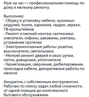 Аккуратно, с собственным инструментом. Работа по списку задач любой сложности: от одной позиции до комплексного бытового обслуживания.