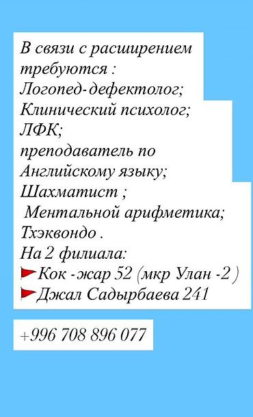 Вакансии в детском саду (2 филиала: Кок-Жар, ул. 52, мкр-н Улан-2;
