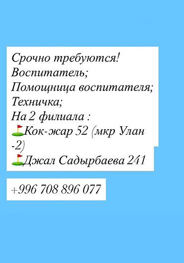Вакансии в детском саду (2 филиала: Кок-Жар, ул. 52, мкр-н Улан-2; Джал, ул. Садырбаева, 241).