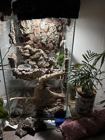 - Оформление: задняя и боковые стенки декорированы корой/панелями под кору, имеются полки и крепления из коры, декоративная коряга для лазания, субстрат внизу, лесной мох, куски пробки.