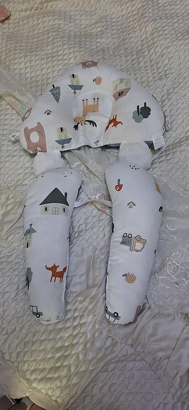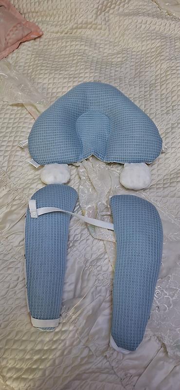 - Комплект из 3 частей: верхняя «бабочка» для поддержки головы и шеи, две боковые/ножные подушки с соединительной эластичной лентой для фиксации положения малыша.